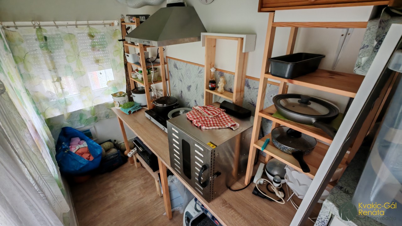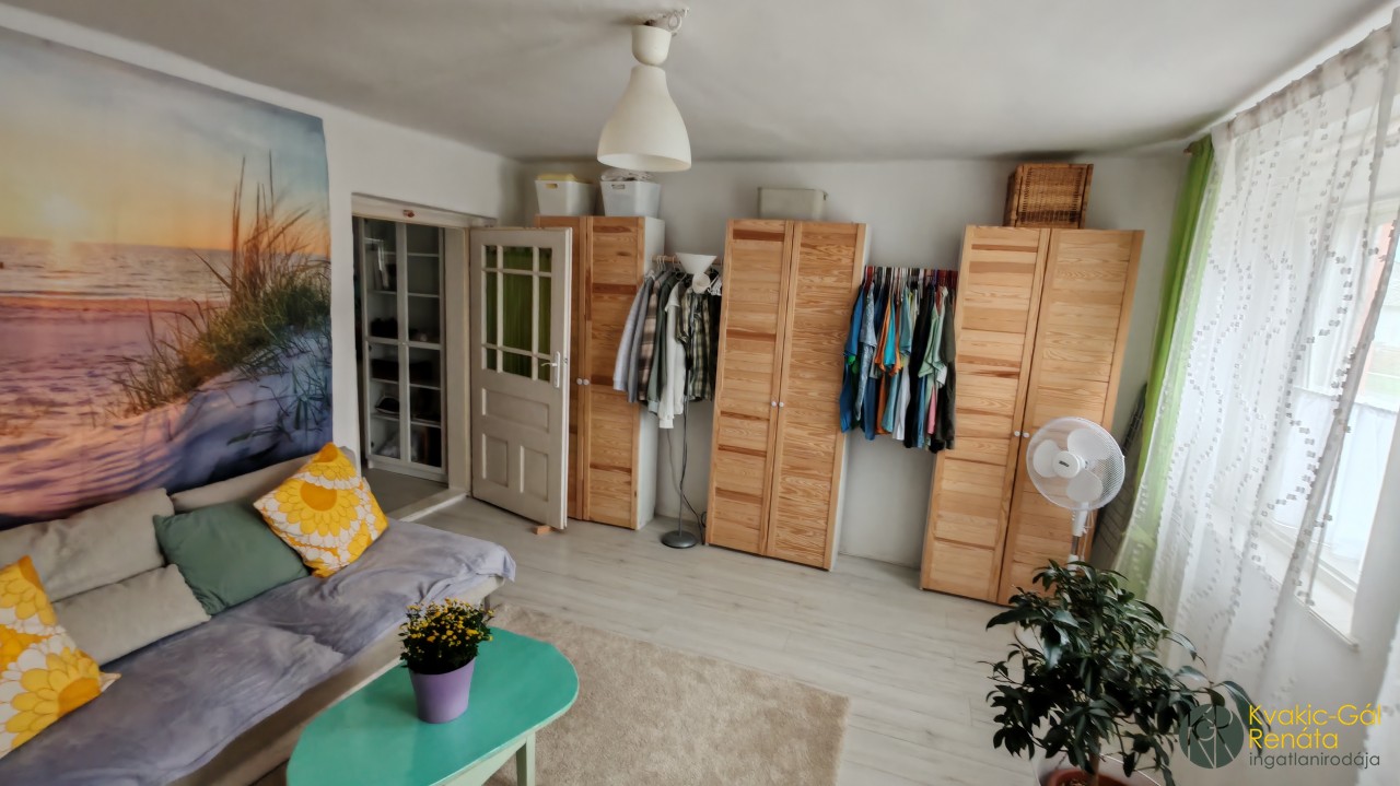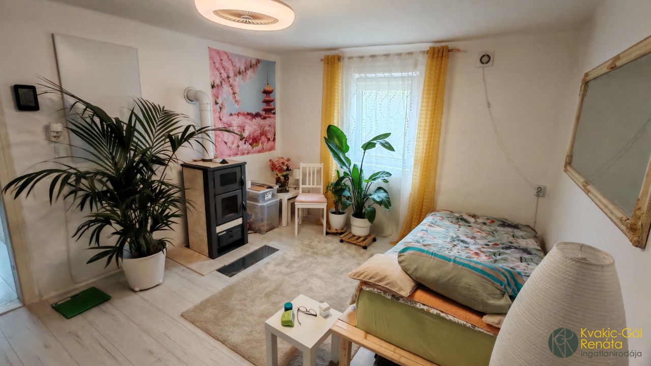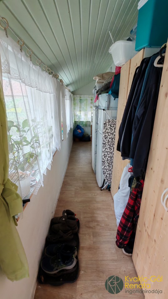 Helyiségek: nappali, hálószoba, konyha, kamra, fürdőszoba WC-vel, előtér külső konyhával