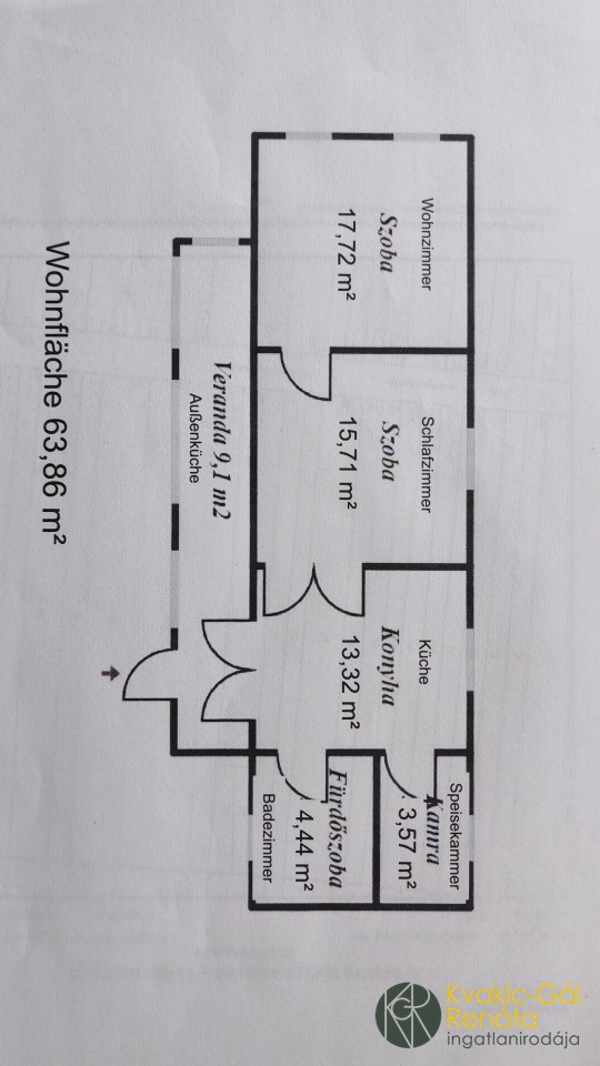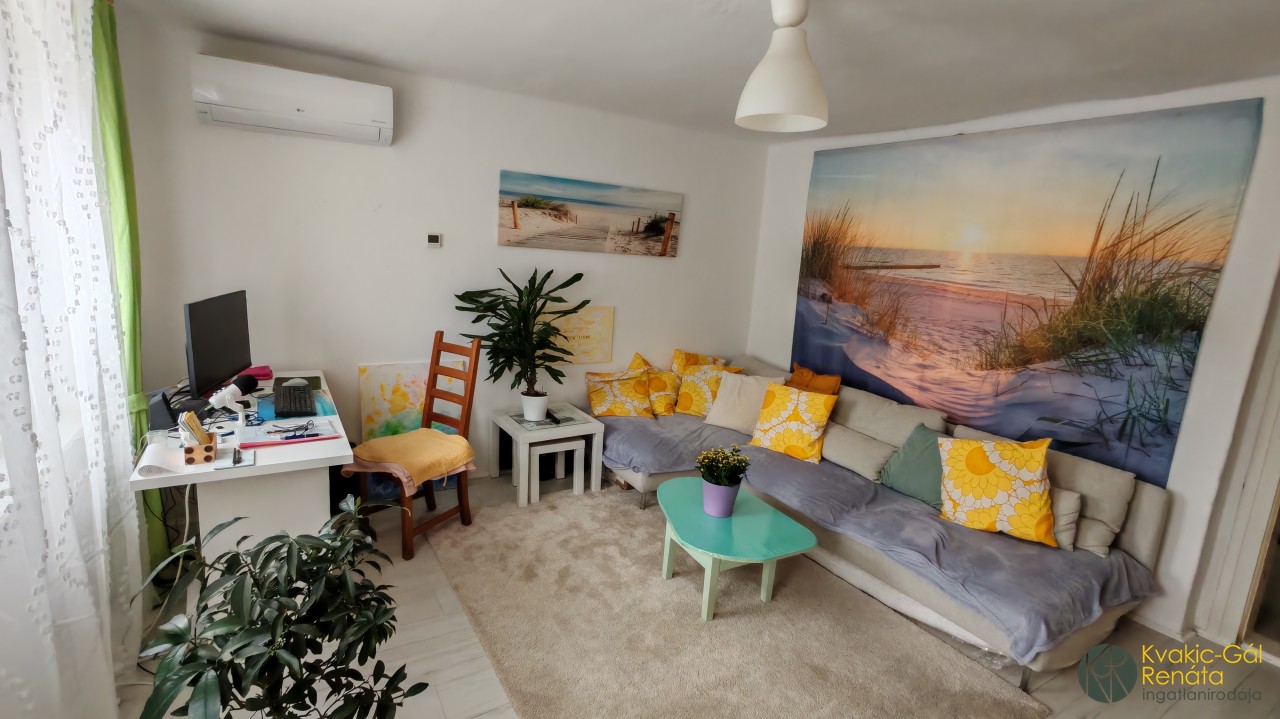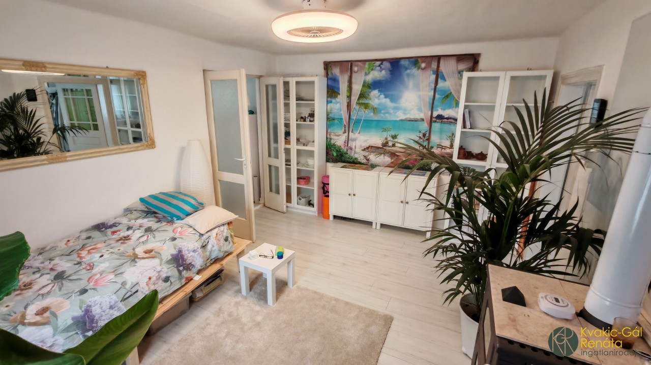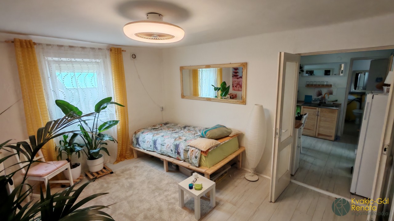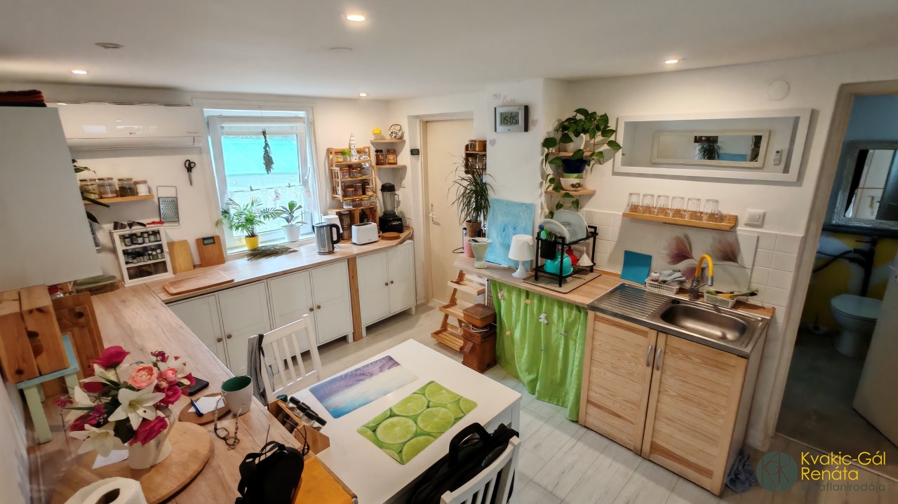 Helyiségek: nappali, hálószoba, konyha, kamra, fürdőszoba WC-vel, előtér külső konyhával