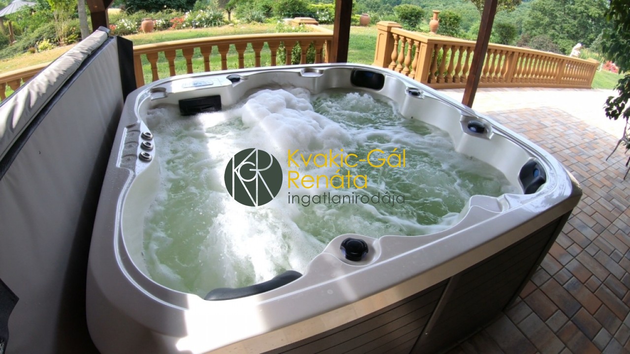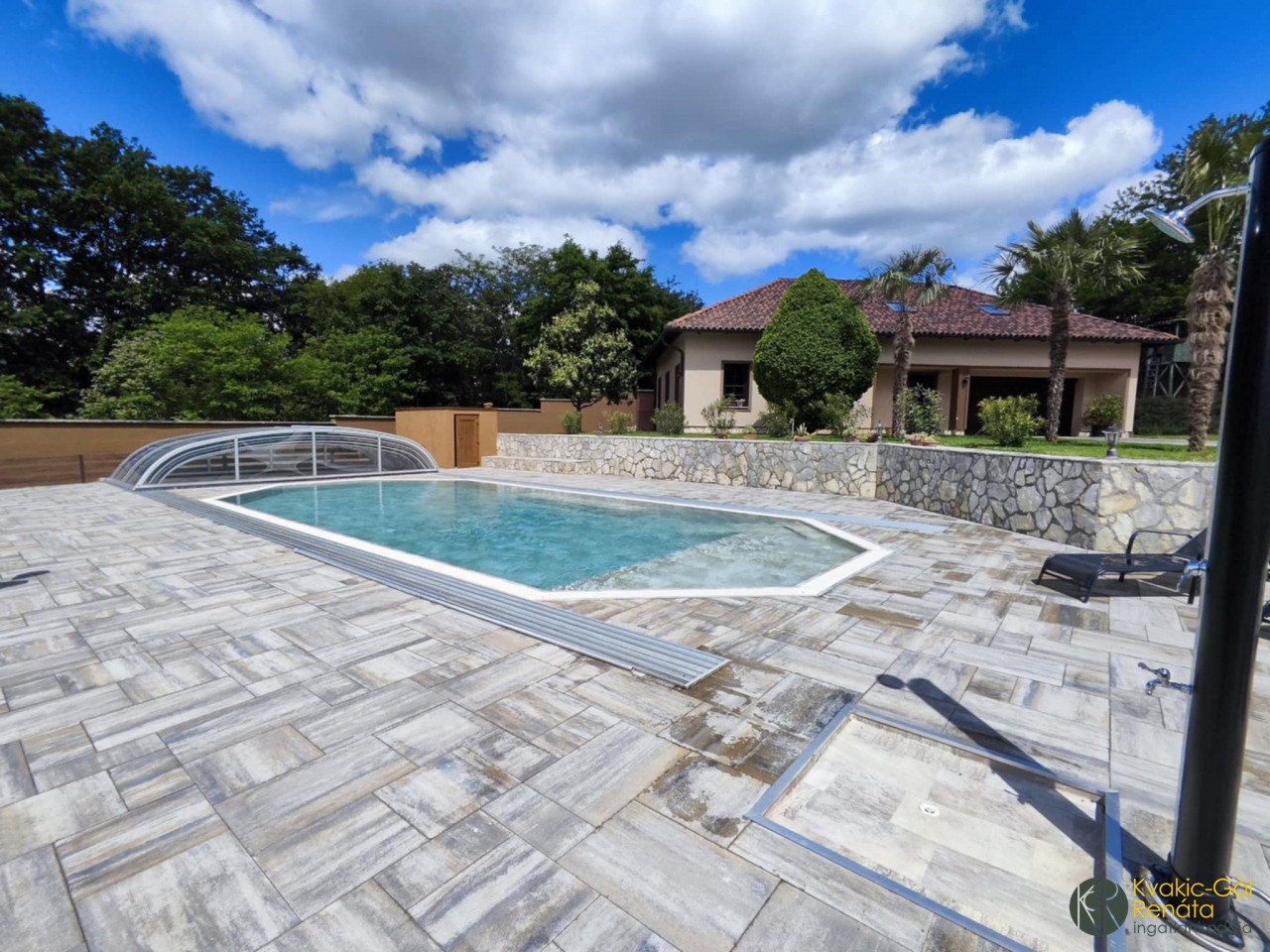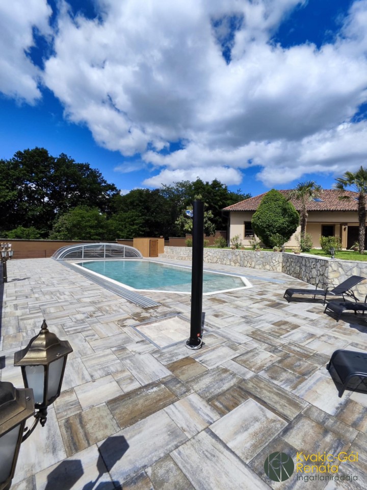A ház mögött, a pálmafák tövében, egy 75 m3 -es medence és egy tágas napozóterasz tárul elénk, mely mellett egy bográcsozó, grillező helyezkedik el. A medence lefedhető, így az első napsugarak már a medence vizének fűtéséről gondoskodnak.