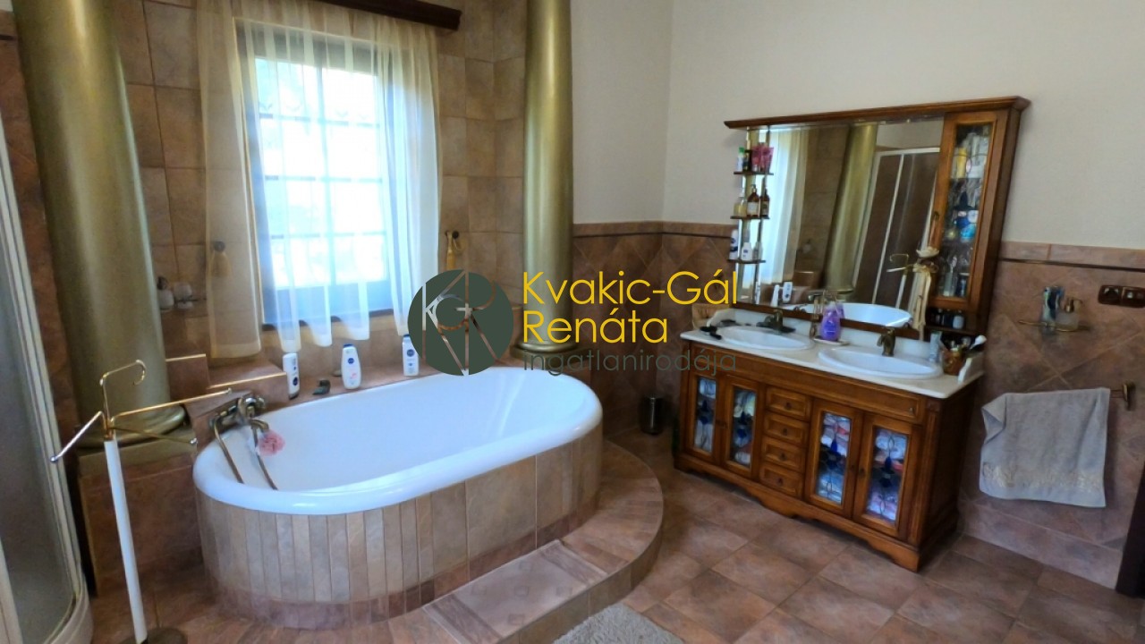 A főépület és a medence mellett elhaladva érkezünk a 180 m2-es nagyságú összkomfortos vendégházhoz, mely 2 szintes, amerikai konyhás, 1 fürdőszobás, 2 wc, duplagarázsos. Fűtése gáz-cirkó. Az emeleti szobák méretüknél fogva lehetőséget biztosítanak a lefelezésre is, abban az esetben is kényelmes hálószoba méreteket kapunk. Ez a vendégház, kiváló üzleti lehetőség lehet akár fizető vendéglátásra, vagy több generáció beköltözése esetében a szeparálására is.