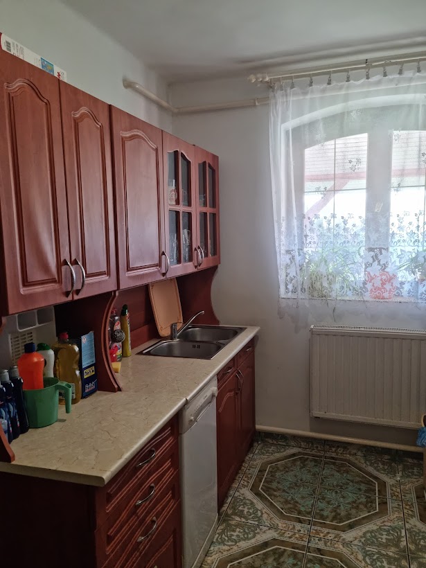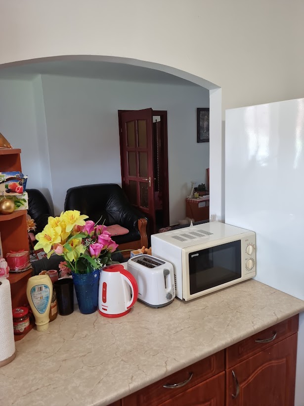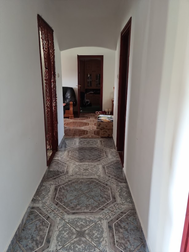 Kisebb ház 60m2-es, kályhával fűthető, jelenleg konyha, nappali, hálószoba, tároló van kialakítva, a fürdőszoba - szerkezetkész- bojlernek, vízvezetékeknek kiállások kialakítva, falak glettelve.