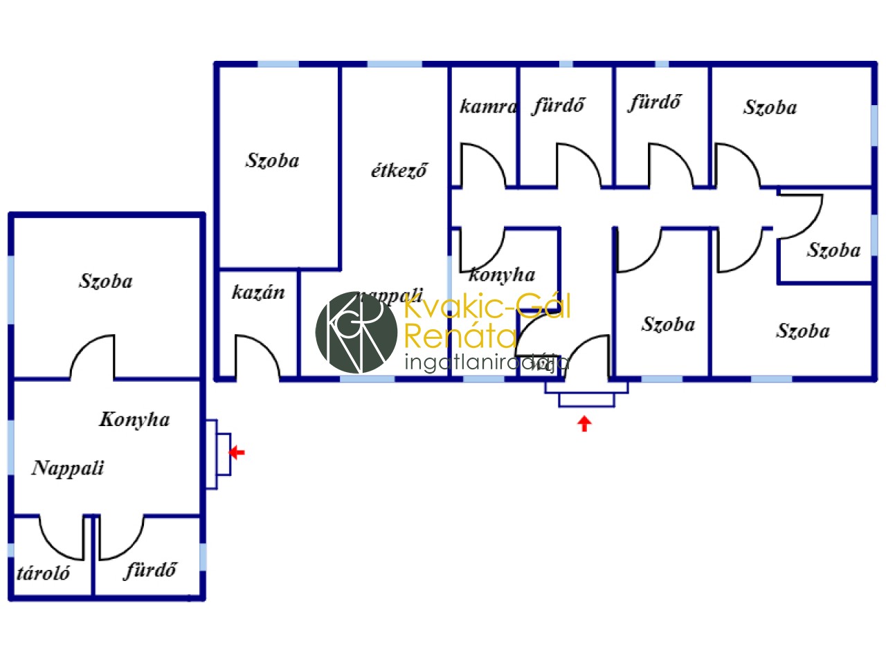 Elosztása: 5 hálószoba, nappali, étkező, konyha, 2 fürdőszoba, wc, kamra , előtér.